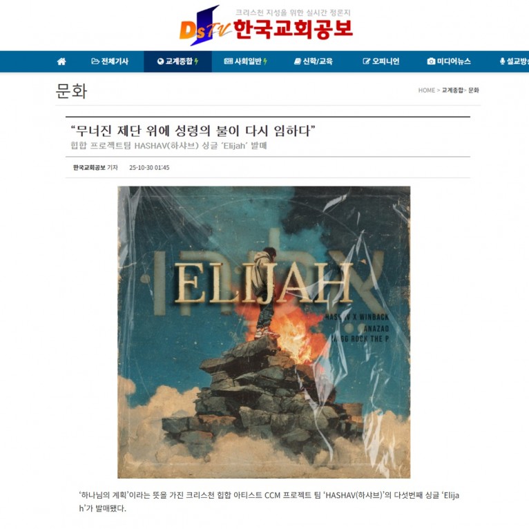 [기사] “무너진 제단 위에 성령의 불이 다시 임하다” HASHAV(하샤브) 싱글 ‘Elijah’ 발매(한국교회공보)