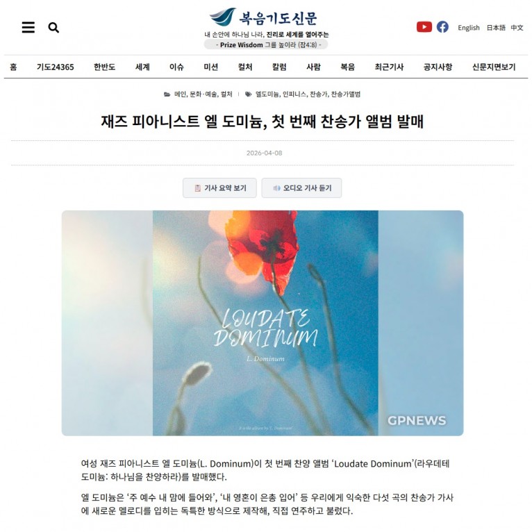 여성 재즈 피아니스트 엘 도미늄(L. Dominum)이 첫 번째 찬양 앨범 ‘Loudate Dominum’(라우데테 도미늄: 하나님을 찬양하라)를 발매했다.